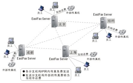 如果集團(tuán)各分支機(jī)構(gòu)都各使用一套EastFax,通過因特網(wǎng)的連接,可將企業(yè)分布在全球或全國的傳真并入集團(tuán)傳真服務(wù)器系統(tǒng),實(shí)現(xiàn)傳真線路自動路由,這樣企業(yè)總部和各分支機(jī)構(gòu)之間的傳真通訊費(fèi)為零,如同內(nèi)部發(fā)送。如發(fā)送系統(tǒng)以外的長途傳真,本地服務(wù)端智能識別,將傳真任務(wù)提交到與長途傳真區(qū)號相匹配的傳真服務(wù)器上發(fā)送出去,從而將長途傳真費(fèi)用減少為本地傳真通訊費(fèi)用。此功能節(jié)省了集團(tuán)系統(tǒng)內(nèi)部發(fā)送傳真的費(fèi)用,節(jié)省高額的長途電話費(fèi)用。適用于多分支機(jī)構(gòu)的集團(tuán)公司。