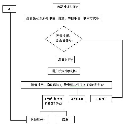 群眾通過自動臺按照語音提示進行投訴、舉報選擇錄音。自動投訴舉報錄音流程如下: