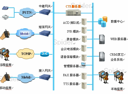 - 座席終端:座席使用的終端可以是IP電話、軟電話、手機(移動坐席)、普通電話用戶等。如果用戶原來的終端為普通電話的話,可以通過IAD即可接入到系統(tǒng)網絡中,因此節(jié)省了用戶的投資。