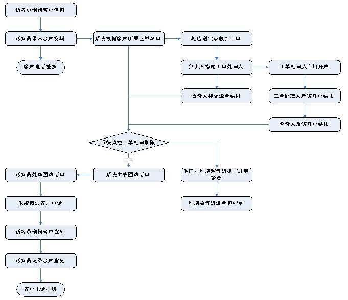 1)業(yè)務(wù)咨詢:用戶通過人工、自動語音等方式咨詢有關(guān)政策法規(guī)、資費標(biāo)準(zhǔn)、用氣常識、報裝方法等,系統(tǒng)以語音、傳真、Email、短消息等方式回復(fù)客戶。