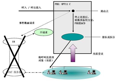 - 當(dāng)RM出現(xiàn)故障(包括Server物理損壞、RM程序意外終止、網(wǎng)絡(luò)連接失效)時,RM將對電話的控制權(quán)交還給PBX,PBX根據(jù)自己的電話分配規(guī)則將電話分配到坐席。