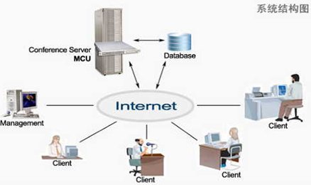 經(jīng)過種種測試,最后選定視維Super-V視頻會議系統(tǒng),山大聯(lián)潤研發(fā)的視維視頻會議系統(tǒng)由服務(wù)器端軟件和客戶端軟件兩部分組成。其中安裝服務(wù)器端軟件的PC服務(wù)器必須有公網(wǎng)固定的IP地址;有較好的網(wǎng)絡(luò)帶寬條件,以保證正常的音視頻信號的傳輸。所有會議成員都需要在其個人計算機(jī)上安裝客戶端軟件,可以根據(jù)具體情況接入IP網(wǎng)絡(luò)。視維Super-V視頻會議系統(tǒng)將所參會人員通過IP網(wǎng)絡(luò)連接起來,提供音頻、視頻以及數(shù)據(jù)協(xié)作等通訊服務(wù)。其網(wǎng)絡(luò)拓?fù)鋱D如下:
