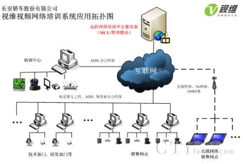 長安轎車大規(guī)模網(wǎng)絡(luò)遠(yuǎn)程會議和培訓(xùn)系統(tǒng)由服務(wù)器端和客戶端組成,服務(wù)器端軟件部署在重慶中心機(jī)房,中心機(jī)房配置1臺單獨(dú)服務(wù)器,支持400個客戶端同時在線,負(fù)責(zé)所有會議和培訓(xùn)的召集、音視頻交互、加密等工作,長安轎車各部門、轄下各零售點通過WEB方式(包括ADSL、3G無線等多種網(wǎng)絡(luò))即可實現(xiàn)客戶端軟件的自動安裝與升級,配備簡單的攝像頭和話筒之后就可以實現(xiàn)長安轎車以及400多零售點的大規(guī)模工作會議和高清音視頻網(wǎng)絡(luò)培訓(xùn)。網(wǎng)絡(luò)拓?fù)鋱D如下: