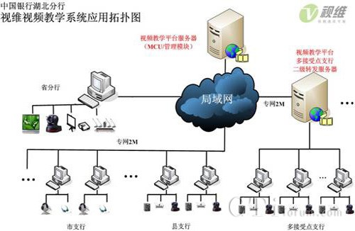 中國銀行湖北分行的視頻教學(xué)系統(tǒng)由服務(wù)器端和客戶端組成,服務(wù)器端軟件部署在省分行中心機(jī)房,配置2臺服務(wù)器,對于接受點(diǎn)超過5個的分支機(jī)構(gòu)配置二級轉(zhuǎn)發(fā)服務(wù)器,共支持全省各支行及支行內(nèi)多個客戶端同時(shí)在線,負(fù)責(zé)所有培訓(xùn)的召集、音視頻交互、加密等工作,各支行通過WEB方式即可實(shí)現(xiàn)客戶端軟件的自動安裝與升級,輕松實(shí)現(xiàn)實(shí)現(xiàn)省分行以及各支行共77余個接受點(diǎn)的高清音視頻視頻教學(xué)。同時(shí)為中國銀行湖北分行的視頻教學(xué)系統(tǒng)配置異構(gòu)兼容模塊,支持與其他視頻會議及軟、硬件視頻教學(xué)系統(tǒng)無縫融合,避免重復(fù)投資造成的浪費(fèi)。網(wǎng)絡(luò)拓?fù)鋱D如下: