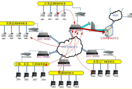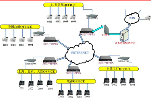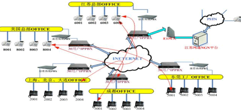 各地的IPPBX會自動識別輸入的號碼,并且通過網絡把號碼送到蘇州總部的1200交換機,江蘇的1200交換機已經通過E1與江蘇網通的NGN服務器對接。網通收到你輸入的被叫號碼,即發(fā)出呼叫,完成你的一次呼叫。如果有新辦事處成立,只要有網絡,可不用申請當?shù)氐碾娫捑路也可實現(xiàn)輕松辦公。