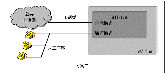 人工座席是呼叫中心(Call Center)一類應(yīng)用的主要組成部分。三匯語音卡對人工座席提供了兩套解決方案:使用SHU系列座席卡,通過交換總線與其它卡互聯(lián),為整個系統(tǒng)提供座席資源。使用SHT系列模塊化語音卡,在部分通道使用座席模塊,可用單塊卡實現(xiàn)座席和外線系統(tǒng)。第二種方式特別適用于小型呼叫中心,總機(jī)話務(wù)員等應(yīng)用。三匯公司的座席通道可以直接連接各類普通電話機(jī),利用座席卡配置相應(yīng)的軟件,還可以構(gòu)成板卡交換機(jī),完全取代企業(yè)用戶交換機(jī)。這類應(yīng)用的典型結(jié)構(gòu)如下圖: