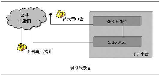三匯公司的SHR系列監(jiān)控錄音卡可以實現(xiàn)對電話線路或其它信號源如話筒信號、對講機(jī)等進(jìn)行錄音。模擬線錄音采用高阻抗并線的方式,對被錄音對象無影響?梢詸z測電話線上直流電壓、DTMF號碼、FSK/DTMF CallerId等信號。采用配套的高阻復(fù)接盒,SHD系列數(shù)字中繼卡還能完成對數(shù)字中繼線的監(jiān)控錄音,并能分析線路上的信令,從而取得通話狀態(tài)和主被叫號碼。這兩種錄音系統(tǒng)的結(jié)構(gòu)如下圖:
