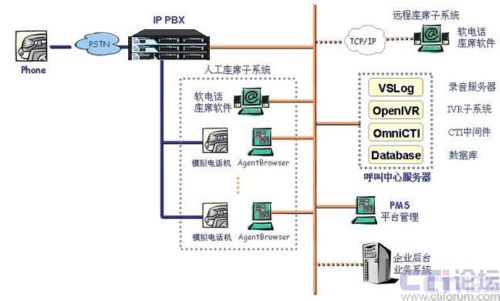 本方案采用IP-PBX 硬件平臺(tái)配合CTI系統(tǒng)軟件來建設(shè)呼叫服務(wù)系統(tǒng)。IP-PBX作為坐席接入的硬件接口平臺(tái),采用上海傲威科技有限公司自主研發(fā)的IP-PBX產(chǎn)品AVX2000pro來實(shí)現(xiàn),AVX2000pro提供標(biāo)準(zhǔn)RJ11固件接口,為坐席員提供語音接入,坐席員耳麥話機(jī)直接與RJ11接口互連。坐席電腦通過局域網(wǎng)口與CTI軟件服務(wù)系統(tǒng)互連。