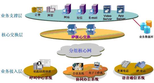 業(yè)務(wù)支撐層:計費、網(wǎng)管、多媒體視頻、應(yīng)用服務(wù)器等各種功能服務(wù)器?膳c用戶的業(yè)務(wù)數(shù)據(jù)庫對接,為整個業(yè)務(wù)提供有力的支撐平臺。確保有效快速的處理呼叫流程、提高工作效率,評估呼叫中心的表現(xiàn)。