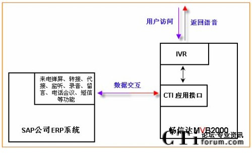 通過集成,不但可以實(shí)現(xiàn)與SAP公司ERP系統(tǒng)的實(shí)時(shí)數(shù)據(jù)傳輸,實(shí)現(xiàn)客戶管理、日常辦公,并且可使ERP系統(tǒng)上具有:點(diǎn)擊外呼、批量外呼、來(lái)電彈屏、收聽錄音、查看報(bào)表、監(jiān)控電話線路等更多增值功能,詳細(xì)接口內(nèi)容見《MVB2000 WEB開發(fā)接口》。