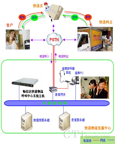 暢信達(dá)快遞物流呼叫中心系統(tǒng)是以暢信達(dá)快遞物流呼叫中心系統(tǒng)主機(jī)為呼叫交換和業(yè)務(wù)受理平臺(tái),選配數(shù)據(jù)庫(kù)服務(wù)器和錄音服務(wù)器,采用人工座席接聽(tīng)來(lái)電與發(fā)起呼叫,系統(tǒng)架構(gòu)圖如下: