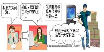外勤短信通知?蛻(hù)電話(huà)下單,貨品規(guī)格重量記入數(shù)據(jù)庫(kù),下單完畢,客服人員選擇片區(qū)取件員,輕輕一點(diǎn),客戶(hù)資料及貨物資料全部發(fā)送至取件員手機(jī),不會(huì)遺忘,不再混淆。