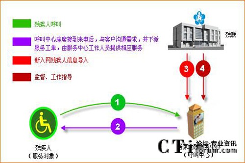 根據(jù)服務轄區(qū)內(nèi)殘疾人的情況,殘聯(lián)將需要提供居家服務的對象提供給服務中心,服務中心將殘疾人檔案信息上傳于系統(tǒng)內(nèi)。當殘疾人通過手機或固定電話撥打“服務中心服務統(tǒng)一電話號碼”(或采用一鍵呼叫的話機呼叫“服務中心服務統(tǒng)一電話號碼”)時,服務中心的座席電腦上就會彈出殘疾人信息(包括:名字、地址、聯(lián)系電話、殘疾類別與等級、身份證號碼、殘疾證號、監(jiān)護人性姓名、監(jiān)護人電話等等)。具體流程如下: