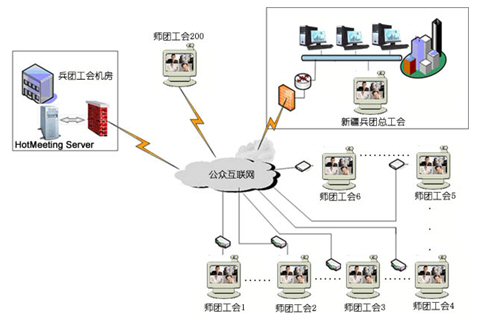 新疆建設(shè)兵團(tuán)工會下設(shè)有14個師工會,111個團(tuán)場工會.共有200個用戶同時參加視頻會議。中心服務(wù)器帶寬為100M光纖,各地終端通過網(wǎng)通2M寬帶接入,每個師、團(tuán)級會場都有自己獨立的機房和會議室,適合進(jìn)行基于IP網(wǎng)絡(luò)視訊會議的應(yīng)用,在這個網(wǎng)絡(luò)平臺上,優(yōu)視(URSACOM)HotMeeting富媒體視頻會議系統(tǒng)所提供的高質(zhì)量的視頻圖像和方便易用的文檔、文件共享功能,使得兵團(tuán)工會領(lǐng)導(dǎo)能夠在這個平臺上進(jìn)行從桌面討論到會議室正式會議等各種規(guī)模應(yīng)用。通過HotMeeting富媒體視頻會議系統(tǒng),除了進(jìn)行全團(tuán)工會系統(tǒng)例會,工作交流等常見的應(yīng)用之外,遠(yuǎn)程培訓(xùn)等也是經(jīng)常進(jìn)行的內(nèi)容。各個師、團(tuán)工會系統(tǒng)能利用數(shù)據(jù)功能和兵團(tuán)總工會協(xié)調(diào)業(yè)務(wù),也能把平常培訓(xùn)的會議材料進(jìn)行詳細(xì)介紹,節(jié)約了以前培訓(xùn)所花費的大量精力和時間。具體網(wǎng)絡(luò)拓?fù)湟娤聢D: