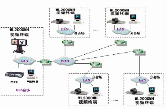 分會場配置WL-2000MH會議終端,具有快速以太網(wǎng)LAN接口,在H.323上可達(dá)到4M。實(shí)際應(yīng)用中,分會場工作速率在512K-2M自適應(yīng)可調(diào)。中心會場可通過局域網(wǎng)對分會場設(shè)備遠(yuǎn)程管理。終端通過RS232口連接攝像機(jī),中心會場可進(jìn)行遙控分會場的攝像機(jī),注本地也可以進(jìn)行攝像機(jī)控制。WL-2000MH會議終端有兩路視頻輸出,一路為遠(yuǎn)端視頻,一路為本地視頻,分會場可選擇兩個顯示設(shè)備如大屏幕彩電或背投電視。