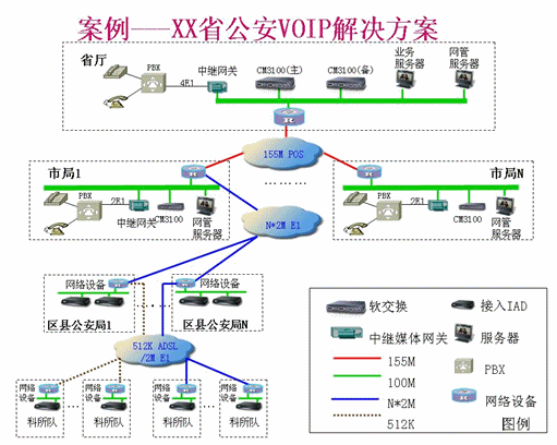 - 全省公安IP語音專網(wǎng)系統(tǒng)采用分布式結(jié)構(gòu),在省廳設(shè)置中心節(jié)點(diǎn),在各個(gè)市局設(shè)置分節(jié)點(diǎn)。省廳軟交換系統(tǒng)為主備雙機(jī)配置,市軟交換系統(tǒng)為單機(jī)配置。