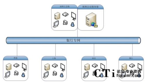 如圖,大新銀行視頻會議系統(tǒng)應用規(guī)模為5個點,包括香港、深圳、上海、南京、鎮(zhèn)江,服務器部署在深圳用來保證香港和內地的鏈接效果,服務器出口帶寬為5M共享,各分會場通過專網訪問服務器。在這個網絡平臺上,紅杉樹網絡視頻會議所提供的高質量音視頻圖像、方便易用的文檔、文件共享數據功能,使得大新銀行能夠在這個平臺上進行從桌面討論到會議室正式會議等各種規(guī)模的應用。在這個平臺上,除了進行日常例會、業(yè)務交流等常見的應用之外,業(yè)務培訓、異地招聘等也是經常進行的內容。業(yè)務人員利用數據功能,把平常培訓很難懂的新銀行產品、費率等進行介紹,節(jié)約了以前培訓所花費的大量精力和時間,為新產品迅速占領市場掌握了主動。