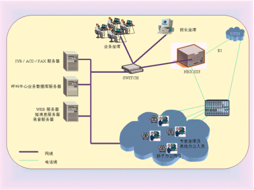 NBX SS3 網(wǎng)絡(luò)電話交換機(jī)作為基礎(chǔ)通信平臺(tái),由北大方正電子技術(shù)有限公司在北京網(wǎng)音公司呼叫中心中間件進(jìn)行集成開發(fā),建立CTI,ACD、IVR、FAX、TTS及其應(yīng)用服務(wù),集成現(xiàn)有的WEB、mail、短消息系統(tǒng),建立統(tǒng)一消息平臺(tái),新建和利用各業(yè)務(wù)數(shù)據(jù)庫(kù),設(shè)計(jì)業(yè)務(wù)坐席及客戶端軟件。