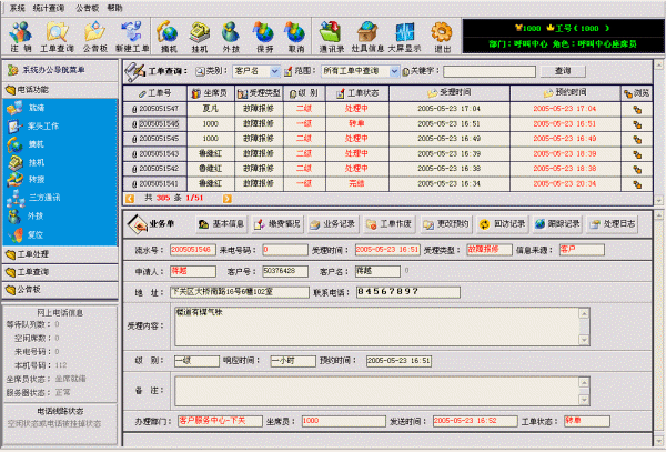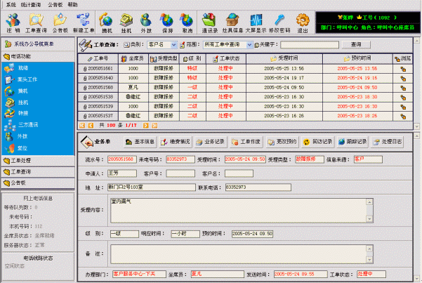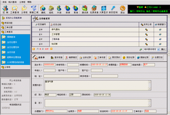 系統聯通了座席員、營業(yè)廳業(yè)務員、工程管理人員、維修網點派工人員、外勤維修人員、公司管理人員等各種角色使用系統的界面。