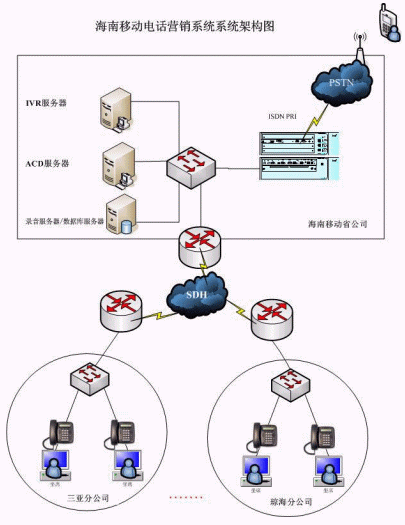 此次為電話營銷系統(tǒng)一期工程,在省公司部署一套NBX V5000系統(tǒng)及相應(yīng)的CTI服務(wù)器,通過2條E1接入PSTN,在18個地市直接部署50個IP電話終端及坐席端軟件,語音走移動已有的MDCN網(wǎng)絡(luò),一個集中受理分布處理的呼叫中心系統(tǒng)就建設(shè)起來啦,本次工程從設(shè)備到貨、系統(tǒng)上線試運行,僅僅用了1個星期,我們海南移動公司的項目經(jīng)理都驚訝的說"太快啦啦,要是使用傳統(tǒng)的排隊機部署一個分布全省的類似系統(tǒng),少說工期也得幾個月"。經(jīng)過1個月的試運行,系統(tǒng)運行穩(wěn)定,各項系統(tǒng)指標滿足合同要求,在11月份系統(tǒng)順利通過初驗。