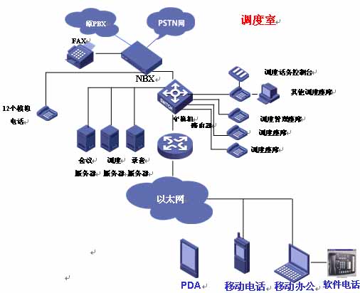 北京市交通應(yīng)急指揮中心,此次項(xiàng)目采用了1500個(gè)設(shè)備容量的華為3Com V3000 NBX系統(tǒng)一臺(tái)為核心語音調(diào)度交換機(jī),連接PSTN網(wǎng)。使用3101標(biāo)準(zhǔn)版IP智能話機(jī)、3102商務(wù)版IP智能話機(jī)和3105話務(wù)臺(tái)總數(shù)量達(dá)到了34部。在已有的網(wǎng)絡(luò)結(jié)構(gòu)中實(shí)施語音系統(tǒng),減少對(duì)網(wǎng)絡(luò)基礎(chǔ)設(shè)施的投資,節(jié)省話路設(shè)備成本、電話系統(tǒng)安裝、維護(hù)和使用管理,還可提供更多的通信業(yè)務(wù)和更強(qiáng)的智能語音功能。結(jié)構(gòu)圖如下: