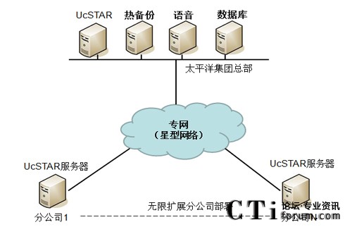 通過UcSTAR統(tǒng)一通信系統(tǒng)實現(xiàn)以公司總部為主的星型架構的通信系統(tǒng)部署,實現(xiàn)集團內(nèi)部的溝通與協(xié)作應用。