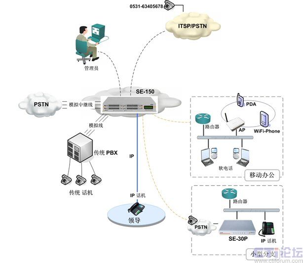 IP PBX即是專為中小企業(yè)量身設計的,其中典型產(chǎn)品為SE150。