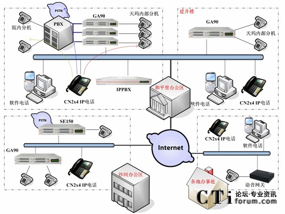 具體情況是:和平里的總部與沙河辦公區(qū)之間為網(wǎng)絡(luò)專線,并有公網(wǎng)出口。各辦事處使用ADSL撥號(hào)上網(wǎng)方式?偛康姆桨冈O(shè)計(jì)中,使用了5臺(tái)GA90網(wǎng)關(guān),兩臺(tái)IPPBX以及多部IP話機(jī)和軟件電話。和平里辦公區(qū)工位數(shù)量為120左右,其中多數(shù)工位需要部署模擬話機(jī),個(gè)別工位屬于非固定的移動(dòng)工位,需要部署CN2x4