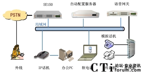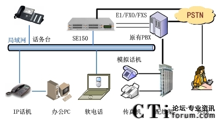 此方案適用于已經(jīng)部署了傳統(tǒng)PBX的企業(yè)。要求企業(yè)部署好數(shù)據(jù)網(wǎng)絡(luò),如果采用模擬終端,則企業(yè)的各個(gè)辦公點(diǎn)需要先將網(wǎng)絡(luò)線路和電話線路部署到位,同時(shí)企業(yè)原有的PBX要預(yù)留與SE150對(duì)接的接口。