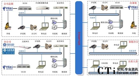 分布式部署:總部和各分支機(jī)構(gòu)的分機(jī),是通過IP網(wǎng)絡(luò)融合在一個(gè)語音平臺(tái)上來實(shí)現(xiàn)內(nèi)部通信?偛亢娃k事處分機(jī)、家庭辦公分機(jī)、出差人員的軟電話均注冊(cè)在總部的SE150上,各分公司的分機(jī)注冊(cè)在本地的SE150上,由本地的SE150管理。