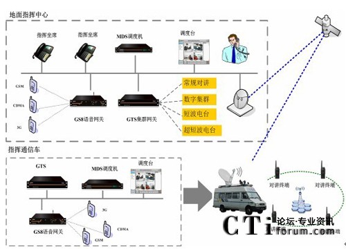 整體系統(tǒng)由地面指揮中心和指揮通信車組成,指揮中心和通信車分別部署調(diào)度臺,均可指揮現(xiàn)場。地面指揮中心和指揮通信車通過部署衛(wèi)星設(shè)備,通過衛(wèi)星鏈路進行通信,當衛(wèi)星鏈路出現(xiàn)故障時,指揮車也可通過移動網(wǎng)絡(luò)(GSM/CDMA/3G)與地面指揮中心互聯(lián)互通。