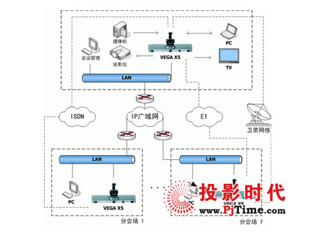 如圖所示,主會場配置1臺愛斯樂VegaX5終端,X5最高帶寬可達4Mbps。內(nèi)置8點混網(wǎng)(IP&ISDN) MCU。在每個分會場采用1臺愛斯樂VEGA X3終端。各會場根據(jù)網(wǎng)絡(luò)情況,可以采用不同的網(wǎng)絡(luò)接入方式。VEGA X5可以支持寬帶IP、ISDN、專線接入等。且X5的內(nèi)置MCU在召開多點會議時可以做雙視頻流傳送,可以同時看到多會場的圖像,聲音也是全部混合的。