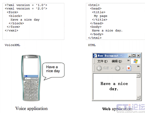 圖一、VoiceXML應(yīng)用和WEB應(yīng)用的比較