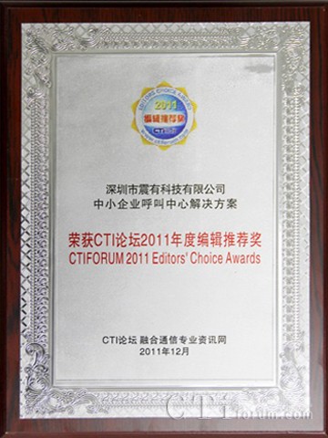 CTI論壇(ctiforum)12月26日消息(記者 張潔): 近日,由CTI論壇主辦的2011年度“編輯推薦獎”評選結果正式揭曉,深圳市震有科技有限公司憑借自主研發(fā)的產品和解決方案榮獲CTI論壇2011年度最佳編輯獎《中小企業(yè)呼叫中心解決方案》。