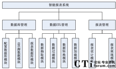 從功能模型圖中分析,可定制報表系統(tǒng)主要包括數(shù)據(jù)庫模塊、數(shù)據(jù)ETL管理模塊和報表管理模塊三大模塊。下面來介紹這幾個功能模塊: