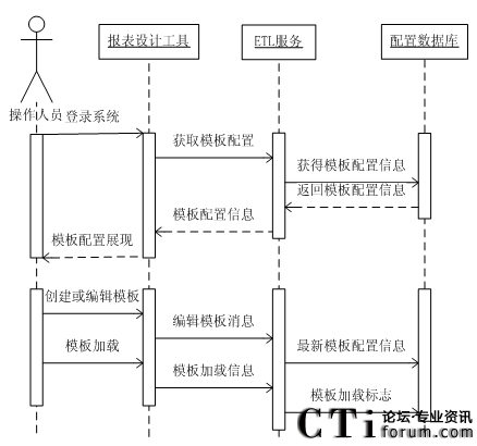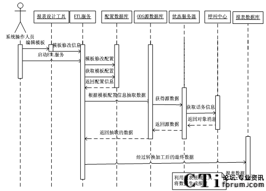 在ETL服務(wù)運(yùn)行時,首先它會從配置數(shù)據(jù)庫中獲取模板的配置信息,并且根據(jù)其配置信息從ODS源數(shù)據(jù)庫中抽取數(shù)據(jù)。ODS源數(shù)據(jù)庫中的數(shù)據(jù)是狀態(tài)服務(wù)器從呼叫中心中獲得的。在ETL抽取數(shù)據(jù)后對其進(jìn)行轉(zhuǎn)換和加工,將其加載到報表數(shù)據(jù)庫中。并利用報表展現(xiàn)工具將報表數(shù)據(jù)展現(xiàn)出來。其最終設(shè)計的系統(tǒng)各部件交互時序圖如圖3.5所示。