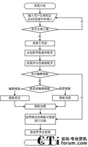 根據(jù)流程圖,使用者在進(jìn)入系統(tǒng)時需要輸入用戶名和密碼以及要連接的ODS數(shù)據(jù)源的IP和端口。如果信息正確,則進(jìn)入到報表系統(tǒng)主界面。然后報表設(shè)計工具會從配置數(shù)據(jù)庫中讀取報表模板配置,再將現(xiàn)在統(tǒng)計數(shù)據(jù)的報表模板信息展現(xiàn)出來。