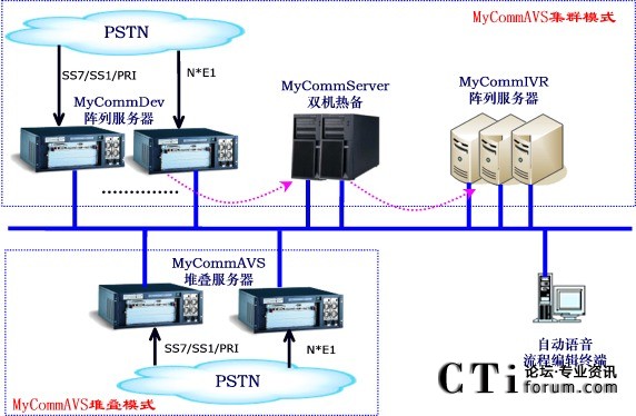MyCOmmAVS集群模式:將三大核心模塊分布部署,其中MyCommServer核心模塊為雙機(jī)熱備,而MyCommDEV和MyCommIVR都設(shè)計為集群陣列方案。其優(yōu)勢的集中監(jiān)控和管理,DEV服務(wù)器和IVR服務(wù)器任何一個節(jié)點的故障都不影響其他系統(tǒng)。