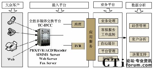 隨著呼叫中心技術的發(fā)展,傳統(tǒng)的語音通話已不能滿足日益增長的業(yè)務需求,TC-IPCC平臺整合了視頻Video、文本Text、電子郵件Email、短消息SMS、互聯(lián)網Web以及3G等多媒體通訊方式。高效、統(tǒng)一的把各種媒體渠道融合在一起,并極大地拓展了聯(lián)絡中心業(yè)務應用的類型和范圍。
