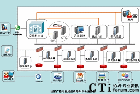 系統主要包含IVR服務器,CTI服務器,短信網關,郵件服務器,傳真服務器,數據庫服務器,座席系統等?蛻魮艽蛱胤柎a接入廣電公司客服系統,首先由IVR提供自動語音服務。CTI服務器負責所有的電話的路由、排隊、轉接和控制?蛻粼诮邮茏詣诱Z音服務時,如果需要人工幫助,可選擇轉入人工座席。由IVR系統向CTI發(fā)出轉接請求,完成轉接功能。