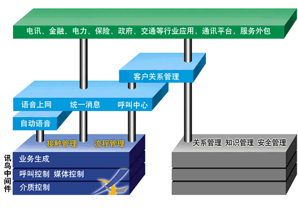 而要支撐這些復(fù)雜的應(yīng)用,中間件應(yīng)該可以進(jìn)行接觸管理、流程管理。和目前已有的關(guān)系管理、知識(shí)管理、安全管理結(jié)合,可以全方位的支撐應(yīng)用系統(tǒng)。訊鳥中間件就是這樣的中間件,它是建立在分布式計(jì)算環(huán)境上,可以控制多種通訊設(shè)備,支撐生成多種業(yè)務(wù)應(yīng)用軟件的軟件。它可以支持語音網(wǎng)的交互,因特網(wǎng)的交互,支持呼叫和數(shù)據(jù)的同步傳輸。它支持工作流程的生成,而不用了解一個(gè)工作流程是如何在不同的設(shè)備上運(yùn)行。同時(shí),它的業(yè)務(wù)描述語言是用中文和圖標(biāo)表達(dá),易于和業(yè)務(wù)接軌,方便系統(tǒng)集成商、最終客戶,給系統(tǒng)分析員提供優(yōu)秀的設(shè)計(jì)工具和運(yùn)行平臺(tái),極大提高了工程的實(shí)施效率。
