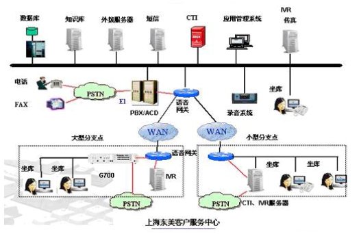中心點(diǎn)和分支點(diǎn)的客服系統(tǒng)通過兩地的語音網(wǎng)關(guān)進(jìn)行語音連接,具體實(shí)現(xiàn)大概是,如果分支點(diǎn)需要把語音轉(zhuǎn)接到中心點(diǎn),分支點(diǎn)把TDM語音轉(zhuǎn)接到語音網(wǎng)關(guān),語音網(wǎng)關(guān)把TDM語音信號轉(zhuǎn)變?yōu)镮P包,通過網(wǎng)絡(luò)發(fā)送到中心點(diǎn)的語音網(wǎng)關(guān)上,語音網(wǎng)關(guān)把IP包變?yōu)門DM語音信號,在接入到交換機(jī)上,由中心點(diǎn)CTI按照指定的策略轉(zhuǎn)接到最終目標(biāo)上。