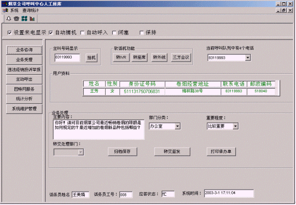 客戶打入電話后,當(dāng)系統(tǒng)的自動(dòng)語(yǔ)音應(yīng)答子系統(tǒng)無法解決客戶問題時(shí),客戶可選擇人工服務(wù),由企業(yè)客戶服務(wù)代表直接接聽客戶電話,處理并解決客戶問題。此時(shí)客戶同座席話務(wù)人員直接溝通,并同時(shí)記錄下該客戶的聯(lián)系方式,將相關(guān)數(shù)據(jù)添加入系統(tǒng)數(shù)據(jù)庫(kù);也可以在數(shù)據(jù)庫(kù)的支持下回答接受查詢卷煙/價(jià)格/限額/新品種、卷煙經(jīng)營(yíng)規(guī)范制度/卷煙專賣政策法規(guī)咨詢、通報(bào)最近暢銷卷煙的限額情況/通報(bào)最近增加的新品種/煙草公司召集的活動(dòng)通知、投訴和舉報(bào)違法經(jīng)銷行為、卷煙預(yù)訂、電話訪銷、滿意度調(diào)查等。