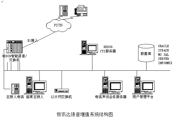 恒訊達(dá)語(yǔ)音增值系統(tǒng)是按照先進(jìn)、可靠、可擴(kuò)展性、長(zhǎng)遠(yuǎn)發(fā)展的要求進(jìn)行設(shè)計(jì),充分體現(xiàn)模塊化系統(tǒng)集成的設(shè)計(jì)思想。既滿(mǎn)足數(shù)據(jù)和語(yǔ)音的功能要求,又滿(mǎn)足業(yè)務(wù)需求的功能要求,同時(shí)考慮系統(tǒng)增值服務(wù)平臺(tái)的發(fā)展空間,以建設(shè)一個(gè)高度信息化、自動(dòng)化的語(yǔ)音增值系統(tǒng)為最終目標(biāo)。整個(gè)系統(tǒng)由可編程交換機(jī)(HXD09)、CTI服務(wù)器、交互式語(yǔ)音應(yīng)答(IVR)服務(wù)器、交互式傳真應(yīng)答(IFR)服務(wù)器、系統(tǒng)后臺(tái)管理、人工座席、業(yè)務(wù)網(wǎng)關(guān)(應(yīng)用服務(wù)器)、數(shù)據(jù)庫(kù)服務(wù)器等部分組成。