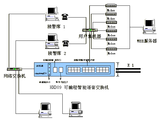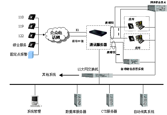 綜合接警平臺主要由hxd09可編程智能語音交換機和計算機網(wǎng)絡(luò)兩部分組成,交換機負責(zé)110、119、122報警電話的接入與分流及調(diào)度呼出等功能;計算機網(wǎng)絡(luò)則完成110、119、122報警信息的顯示、數(shù)據(jù)儲存、統(tǒng)計及信息查詢、發(fā)布功能。