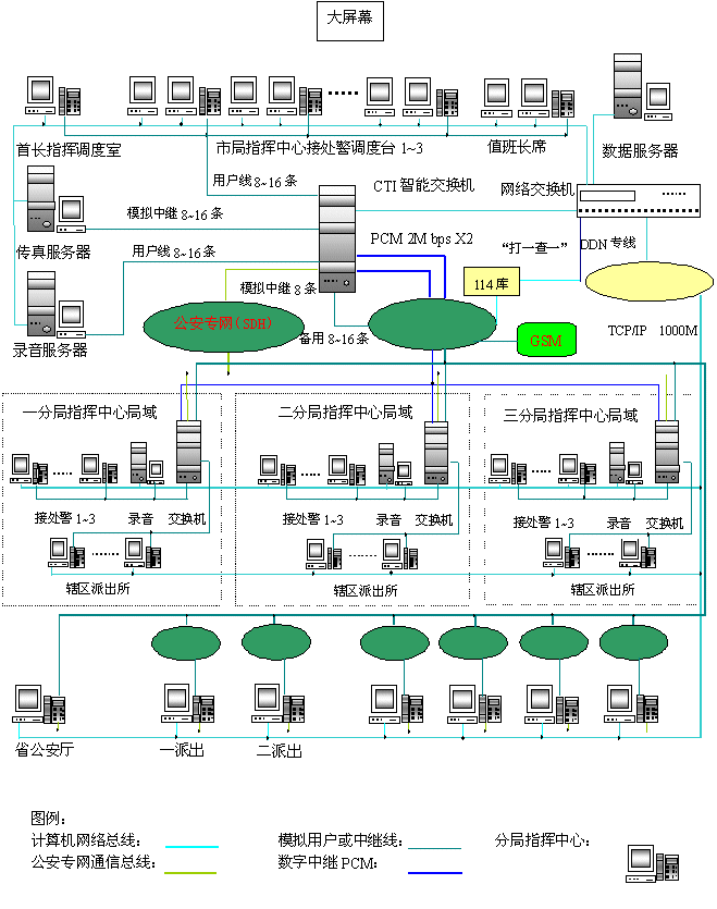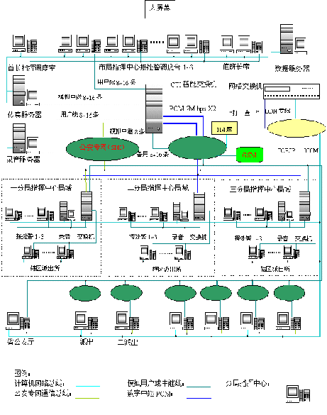 - 樹立大網(wǎng)絡(luò)概念:采用先進的通訊、計算機網(wǎng)絡(luò)技術(shù)(采用CTI可編程交換技術(shù)),利用現(xiàn)有的通信資源,實現(xiàn)市局指揮中心與消防大隊、交警大隊、各派出所的計算機網(wǎng)絡(luò)及相關(guān)領(lǐng)導(dǎo)辦公室計算機大聯(lián)網(wǎng);形成全市范圍內(nèi)110、119、122有線、無線全方位立體調(diào)度語音通道大網(wǎng)。