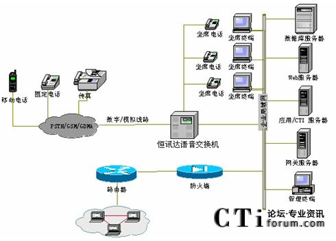 系統(tǒng)采用的硬件根據(jù)實(shí)際需求配置,如果實(shí)際接入電話容量小于30條線,系統(tǒng)與市話要采用普通模擬中繼線接入, 可選擇配置恒訊達(dá)公司HXD09的模擬板(AT0),申請(qǐng)的普通模擬中繼線需開(kāi)通來(lái)電顯示業(yè)務(wù),如電信部門(mén)不開(kāi)通項(xiàng)服務(wù),采用此種接入方式無(wú)法實(shí)現(xiàn)來(lái)電顯示功能;根據(jù)接入容量和話務(wù)員數(shù)量的總和計(jì)算卡的應(yīng)用數(shù)量,如實(shí)際接入電話容量大于等于30條線,則可采用E1接口數(shù)字中繼線接入,