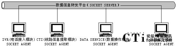 系統(tǒng)擁有的眾多的功能模塊程序都被設(shè)計成為一個個相對獨立的程序。每個程序都作為一個SOCKET AGENT登錄到系統(tǒng)擁有的數(shù)據(jù)信息轉(zhuǎn)發(fā)平臺(它實際上是一個SOCKET