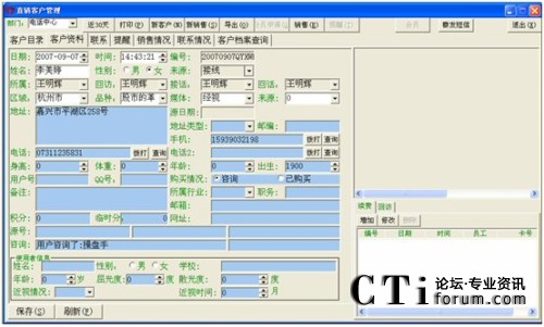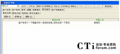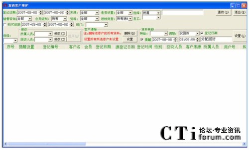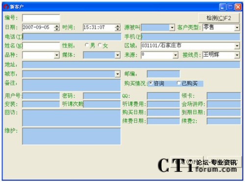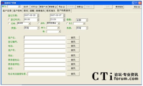 注:對于登記日期一直到客戶名這一段條件的查詢(即上圖中所有的那些查詢條件),都得點(diǎn)擊客戶名欄對應(yīng)的那個查找按鈕才能進(jìn)行有效的查找,否則若點(diǎn)擊其它按鈕(姓名電話直接檢索對應(yīng)的查找除外),都會提示“請輸入****”這種錯誤信息。而點(diǎn)擊最后一個查找,也是無效的,會轉(zhuǎn)到客戶管理中空白信息欄(即什么也查不到)。