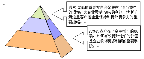 。。從抽象和通用的意義上講,多數(shù)企業(yè)的客戶價值分布是適合"二八法則"的,即20%的客戶創(chuàng)造了80%的利潤。但對每個企業(yè)而言,要洞察"究竟哪些客戶才是最有價值的客戶?""這些客戶在哪些方面的價值最大?""他們有什么共同的特征?"卻不是一件很容易的事。目前,多數(shù)企業(yè)的管理方式還停留在根據(jù)某一項或兩項單一指標(biāo)(如銷售額或利潤)來作的客戶排行,無法進行多方位的綜合的客戶價值分析、管理。而要實現(xiàn)"以客戶為中心"的CRM理念,就必須建立一套全面的客戶價值評估管理系統(tǒng),并利用系統(tǒng)強大的數(shù)據(jù)分析、挖掘功能,快速地進行客戶群價值細分管理,建立起客戶價值金字塔。